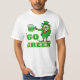 Este divertido duende bebado ficou "verde" para o Dia de São Patrick. Ele está segurando uma grande caneca de cerveja verde e colocando a mão sobre a boca porque ele está se sentindo mal/enjoado e pode estar prestes a vomitar. É o que ele ganha por se envolver em tais shenanigans. As letras "Go Green" são grandes, com algumas pequenas vinhas/ pinceladas saindo delas. Isso daria um presente humorístico para uma festa de Paddy de Ruas, para qualquer um que precise de uma camisa verde de sorte.