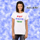 "NÃO ADULTAR HOJE" é o texto humorístico desta camiseta. Tem cores vermelho, azul e verde brilhantes, e um rosto rabiscado no 'O' de NOT.