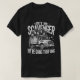 Esta camiseta preta mostra um gráfico de um caminhão de cinza com cinco guaxinins de desenho sentados em cima. O texto "ENTRE EM SCAVENGER" está acima do caminhão, e "NÓS VAMOS AMEAÇAR" está abaixo. Estrelas estão espalhadas pela design. Esta camisa é perfeita para qualquer um que adora terraplenagem e varreduras.