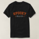 Ilustração do Dia das Bruxas com design de texto "estação assustadora" e aranhas em cores branca, laranja e negra