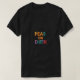 A design da camiseta apresenta a frase "Ervilhas na Terra" em uma fonte ousada e geométrica, com cada letra em uma cor vibrante diferente. O texto é impresso em uma camiseta preta e a imagem é fotografada com uma profundidade de campo superficial.