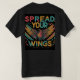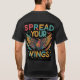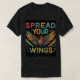 Uma ilustração vibrante e colorida de um pássaro espalhando suas asas, com o texto "Espalhe suas asas" em letras negrito. A imagem transmite uma sensação de liberdade, esperança e inspiração, encorajando os espectadores a abraçar seu potencial e voar alto. É um design poderoso e elevador que pode ser usado em t-shirts, posters e outras mercadorias.