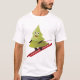 Camiseta masculina de inverno bonito com uma ilustração engraçada de um pinheiro feliz sorridente que adora esquiar descida no inverno. Tem um belo esqui vermelho e desce com alta velocidade sobre uma encosta de neve. O céu azul está limpo e algumas nuvens brancas só o iluminam mais. Os flocos de neve estão em todo lugar. Esta ilustração fofinha do pinheiro apelará a alguém que ama esqui e a estação de inverno.
