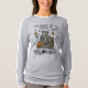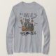 O esqueleto assustador está pegando folhas de outono enquanto elas caem no chão. Seu gato preto e uma abóbora com cara de jack o'lantern estão ao seu lado e morcegos estão voando por aí. É uma camisa gótica divertida e assustadora, perfeita para o Halloween ou um chá de noiva em torno do feriado!