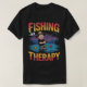 Esta camiseta preta apresenta uma mensagem ousada e entusiástica para os entusiastas da pesca. As palavras "FISHING IS MY" são apresentadas em caracteres grandes, brancos, ligeiramente curvos no topo. Abaixo, uma ilustração cartoon mostra uma pessoa vestindo um chapéu de pesca, segurando uma vara de pesca e enrolando em um peixe grande. A palavra "TERAPIA" aparece no fundo numa fonte maior, amarela. O fundo mostra uma cena estilizada de lago com árvores e um pôr do sol ou nascer do sol. Esta design sugere, com humor, que a pesca é uma atividade terapêutica e relaxante.
