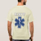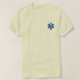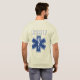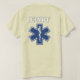 D. Na frente da camisa está "EMT" sobre uma estrela azul e atrás está o mesmo símbolo de resgate EMS em tamanho maior.