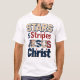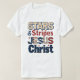 Este design apresenta uma t-shirt branca com o texto "STARS & Stripes" em tom e vermelho, acima de "JESUS", preenchida com estrelas e padrões de listras, e "Cristo" em azul escuro.