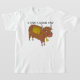 "Eu adoro um bom yack" um sorriso alegre com bolsas amarradas nas costas dele. Estilo de desenho, iaque castanho e cabeludo.