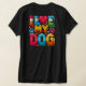 A design da camiseta apresenta a frase "Eu amo meu cachorro" em uma tipografia ousada e brincalhona. A palavra "Amor" é representada por um grande coração vermelho, acrescentando uma vibrante pop de cor. Ao redor do texto estão lindas, pegadas e pequenas ilustrações relacionadas a cães, como ossos e coleiras de cães. A design é simples, quente e perfeita para expressar o afeto de um dono de cachorro em um estilo divertido e casual.