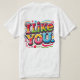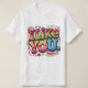 A design da camiseta "Eu gosto de você" apresenta uma frase divertida desenhada à mão em letras arrojadas e peculiares. O texto é o ponto focal, escrito de forma casual e amigável com cores vibrantes, dando-lhe uma vibração divertida e acessível. Ao redor das palavras, há pequenos rabiscos como corações, estrelas ou smileys face para melhorar a mensagem positiva e leve. O design sente-se fresco e jovem, perfeito para espalhar positividade e boas vibrações.