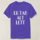 Um texto norueguês: eg tar alt lett, que pode ser traduzido para: aceito tudo facilmente. Esta camiseta roxa pode ser personalizada para lhe dar uma aparência única. Você pode personalizar o tipo de fonte, a cor, o tamanho, alterar o texto, remover e adicionar texto, adicionar foto e muito mais.