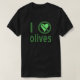 Eu odeio azeitonas. O design usa letras verdes, um coração verde e o sinal internacional "NÃO" para ler "Eu odeio azeitonas". Para aqueles que não "amam" elas, realmente as desaprova, mas têm senso de humor, amam rir e têm o osso do humor tickled.