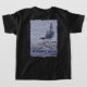 a gaivota de mar retira esquerdo de palco - grande t-shirt por um dia na praia! A foto neste t-shirt mostra uma gaivota de mar de atrás, andando ao longo da areia para o oceano. O pássaro tem uma banda preta com dits brancos na ponta de sua cauda. As cores são os cinzas mornos da gaivota de mar e da praia, com as cinzas mais azuladas da água. A foto tem uma borda áspera, com as palavras "que eu sou outta aqui!" na parte inferior.