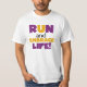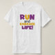 Se você gosta de correr, correr 5Ks, 10Ks, meia maratona, ou maratonas, você vai adorar este design de texto colorido em roxo e amarelo que lê Run and Embrace Life! Corra e Abraça Camisas de Vida, capuzes, ímãs, botões, cartões, adesivos, correntes-chave e muitos outros itens para corredores que adoram um design brilhante e colorido!
