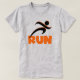 Tirando T-shirts, canecas, bolsas, guardas, topos de tanques, capuzes, e outros roupa e presentes para corredores com uma pista de silhueta preta e um texto laranja que lê RUN. Esses itens de roupa RUN e presentes são excelente para qualquer um que esteja treinando para um 5K, qualquer um que apenas ame correr, ou alguém que já tenha realizado várias maratonas!