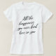 Toda a felicidade que você encontrar está em sua camiseta é perfeita para aqueles que procuram uma camisa que os faz se sentir felizes. A camisa é branca com as palavras "Toda a felicidade que você encontra está em você" em letras negras.