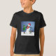 Camisa de Natal com uma ilustração de um menino e cão construindo um boneco de neve.