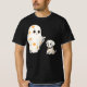 Fantasma Fofo e Camiseta de Halloween para Cão e Dono com Fantasia de Fantasma - Truque ou Gostosura Espeluznante 🎃👻 Adicione um charme assustadoramente fofo à sua roupa de Halloween com este design adorável de fantasma e cachorro! Com um fantasma sorridente com olhos cintilantes e um cachorrinho vestido com uma folha combinando com pegadas laranjas, esta camiseta é perfeita para amantes de cães, pais de animais de estimação e qualquer um que queira uma reviravolta divertida na moda de Halloween.