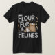 Um design com um sorriso de gato preso ao lado de um saco de farinha, com palhetas decorativas dançando ao redor do local. O texto "Farinhas, Peles e Felinos" é reproduzido em uma fonte artística ousada que tece através da imagem. Esta design celebra a alegria de assar e o calor da companhia felina. Impresso sobre um fundo preto sólido para uma aparência limpa e moderna.