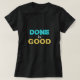 Mensagem simples em negrito — Feito é Bom. Parabéns por fazer isso. Vai! Mostrado em camisa preta, também pode ser usado em qualquer cor escura ou clara. Cores de fontes são aqua e ouro. Motto é popular em muitas pessoas, incluindo Bryn Mawr Alumnae.