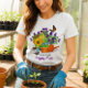 Se você gosta de jardinagem então você vai adorar esta camiseta. Esta camiseta branca apresenta estações de vastidão com flores roxas de Viola, lata de rega e outras necessidades de jardim. Eu adicionei uma camada de um pássaro e uma borboleta e senti que eles fazem esse design perfeito. Comprar este verão de chá branco para você ou como presente para outro jardineiro.