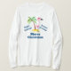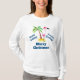 Uma camisa de manga longa para mulheres com o texto: Feliz Natal, feriados felizes e temperos. Projetado com um desenho caprichoso de um flamingo rosa vestindo um chapéu de santa vermelho. Em pé num monte de areia amarela da praia com uma palmeira de coco verde e marrom na parte de trás. Design tropical festivo, bonito e divertido.