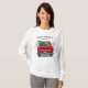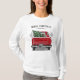 Esta camisa de Natal apresenta um caminhão vermelho vintage com uma árvore de Natal e um ano na placa de licença para personalização. Acima se lê "Feliz Natal" em tipografia negra. Projetado pelo renomado artista Tim Coffey.