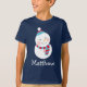 A adorável camisa azul marinho de Natal apresenta um bonitão alegre de neve em um chapéu de inverno e cachecol em tons festivos de azul e vermelho. Personalizar com texto personalizado para o primeiro nome da criança.