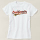 Camiseta feminina branca da Califórnia com pôr do sol e palmeiras. Este design apresenta a palavra "Califórnia" em uma fonte com cauda rebuscada com palmeiras e cores de pôr do sol. Você vai adorar esta camiseta da Califórnia para homens se você ama os pores do sol da Califórnia.