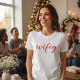Celebre o amor, o riso e a vibração de recém-casada com a nossa Camiseta Feminina de Script Moderno Colorido Wifey com Coração. Projetada com um script manuscrito fofo e moderno e um detalhe de coração charmoso, essa camiseta é perfeita para noivas, esposas e mulheres que orgulhosamente ostentam seu status de "esposa". Se você está procurando um presente de casamento, presente de chá de panela, roupa para festa de despedida de solteira, surpresa de aniversário ou um look divertido para o dia a dia, essa camiseta oferece conforto e estilo em um design lisonjeiro.
