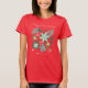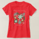 Camiseta de Natal em estilo com a camiseta de Natal festiva moderna. Apresenta lindas flores pintadas manualmente em um tradicional esquema clássico de cor vermelha e verde. Personalize a t-shirt adicionando o seu nome personalizado detalhes personalizados. O plano de fundo apresenta um vermelho. Arte original de Caroline Bonne Müller