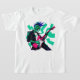 Um esqueleto robótico com um mohawk azul estilo punk toca uma guitarra elétrica rosa brilhante que emite ondas de energia elétrica quando tocado. o robô veste uma jaqueta de couro preto.