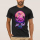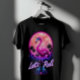 Um flamingo de patins vestindo óculos de sol sob uma lua neonatal com palmeiras