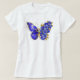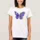 Jewelry, blue, sapphire, sparkling flower butterfly with wing decorated with blue, precious flowers with gold leaves on white background.