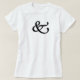 Uma camiseta branca de manga curta para mulheres ou homens com e grande sinal que diz 'E...' na frente.