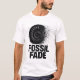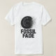 A fossil outline fades and cracks, symbolizing vanishing resources. Stark black-and-white makes the urgent message unmistakable on dark apparel.