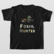 Fossil Hunter gráfico mostra um colecionador perspicaz examinando parte de um fóssil com os restos ainda enterrados abaixo do solo. Abaixo estão as palavras "Fóssil Hunter" com as letras ocasionalmente quebradas como um fóssil poderia ser. Uma design divertida para fãs caçadores de fósseis.