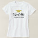 A camisa de festa de formatura comemora o formando com um design simples e na moda que inclui o nome do formando no roteiro moderno e seu ano de aula, acentuado com um boné de formatura. O espaço para uma foto opcional é incluído na parte de trás da camisa - perfeito para exibir seu retrato favorito do mais velho ou a foto da cerimônia de graduação. As cores pretas, douradas e brancas podem ser modificadas.