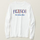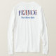 Camiseta de manga longa personalizada para mulheres, com a palavra "FRANÇA" no tricolor francês de azul, branco e vermelho, com cada letra contendo todas as três cores. Adicione um nome para criar um presente especial para si ou para os entes queridos. Perfeito para honrar o patrimônio em reuniões de amigos ou familiares. Ideal para celebrar o Dia da Bastilha.