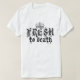O t-shirt branco caracteriza uma tela de "fresco à morte" escrita na rotulação inglesa velha e em uma coroa para cobri-la fora toda.