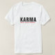 A humorous women's t-shirt with bold text that reads "Karma never loses an address."