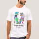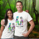 Aprecie seus convidados de casamento com esta curiosa noiva T-Rex e uma camiseta colorida de casamento de dinossauros. Fácil de personalizar com os nomes da noiva e do noivo e a data do casamento. Imagens de noiva T-Rex e dino de noivos psicodélicos com tipografia moderna. Arte original única da artista Catherine Sweetman