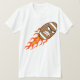Esta design é de um futebol americano que está em chamas. É feito no estilo de desenho animado. O futebol americano está voando pelo ar com chamas saindo do fim. O futebol também tem um rosto que tem uma expressão determinada e revoltada. Esta design de futebol americano parece excelente nesta camiseta masculina. Perfeito para si mesmo ou como presente