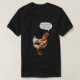 Uma camiseta engraçada com uma foto de uma galinha, com uma bolha de fala contendo as palavras 'Agora é a sua vez. Por que você atravessou a estrada? Uma camiseta esquisita que certamente vai ter.