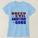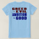 Letras grandes e vermelhas escuras leem, "ganância é mau". Grandes letras azuis escuras leem, "a ambição é boa". Faça sua voz ser ouvida! É a ambição que nos faz uma nação excelente, e a ganância que a destrói. E uma filosofia maravilhosa.