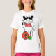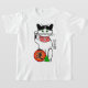 Este t-shirt caracteriza um gato afortunado japonês que beckoning no dinheiro. Veste o sino tradicional e o babador vermelho e em seus pés é uma lanterna festiva com o caráter para a "sorte" e um guindaste de papel que representa a paz. À direita, os caráteres leram do "o neko maneki" ("beckoning o gato ").