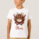 Esta t-shirt personalizada das crianças kawaii apresenta um gato fofo adormecido num capacete minúsculo e ouro samurai. Seus olhos redondos brilham com determinação. Quatanas cruzadas, adoradas com estampas bonitas, descansam graciosamente atrás do gato, completando a foto ousada.