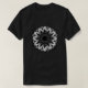Black geometric sunflower mandala on white tee. Intricate botanical graphic for modern style.