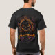 A camiseta na imagem tem um design do Halloween que apresenta uma imagem central de uma abóbora laranja com rosto ameaçador, rodeada por dois crânios, teias de aranha, morcegos e uma lua de cheio com uma silhueta de morcegos adicional. A palavra "HALLOWEEN" aparece de forma destacada na parte inferior em caracteres a negrito e estilizados.