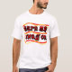 t-shirt branco com escrita vermelha e preta em que diga a "volta meus ganhos" com design vermelho, alaranjado, e amarelo